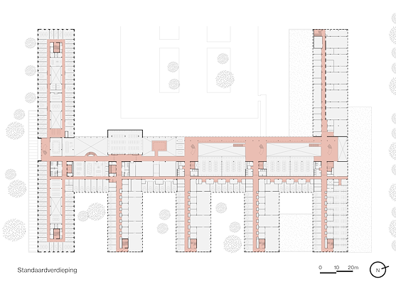 De nieuwbouw heeft een kamvormige hoofdstructuur. Een centrale as fungeert als ruggengraat en verbindt de verschillende gebouwvleugels met elkaar. Deze opzet met bouwdelen en hoven maakt het mogelijk dat eenieder aan de gevel werkzaam is, met daglicht en uitzicht op de omgeving, laten de architecten weten.