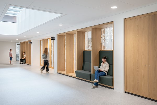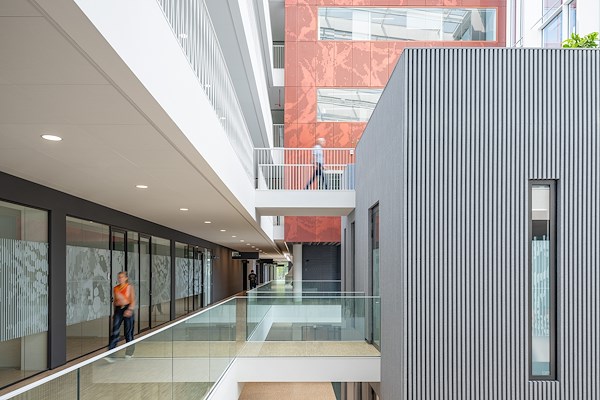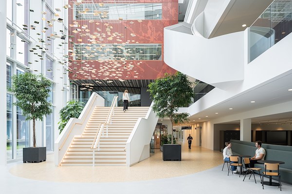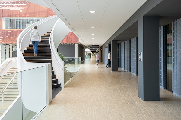 In het interieurontwerp is gekozen voor een eenduidig palet om de heldere architectuur kracht bij te zetten, meldt Ex Interiors. Tactiel materiaal- en kleurgebruik van vilt, hout en groentinten met oranje en lichtblauwe accenten zijn het basispalet voor de algehele inrichting. Hiermee ontstaat een coherent beeld dat de ruimtelijke kwaliteit van het gebouw intact laat, maar wel elk specifiek gebied voorziet van een warme uitstraling en het nodige comfort, aldus de ontwerpers.