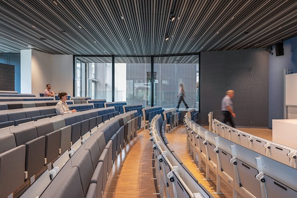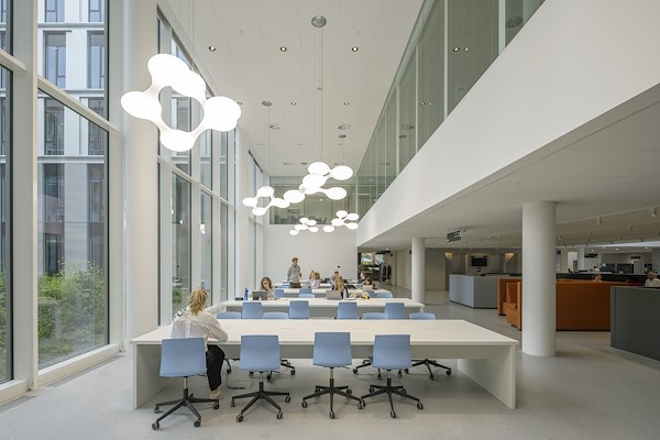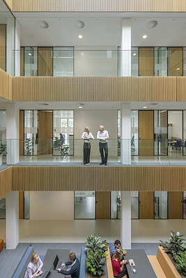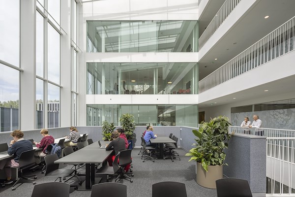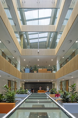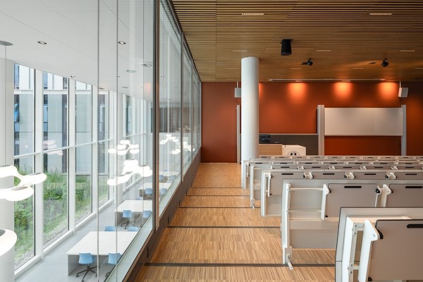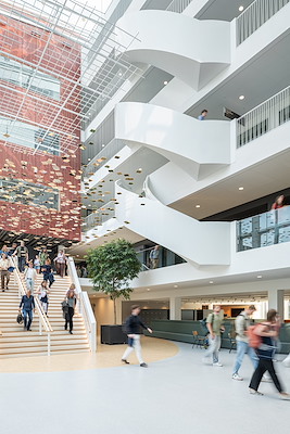 De centrale as met gebouwhoge atria fungeert als het functionele en sociale hart van de faculteit. De verschillende deelgebieden van de faculteit worden er verbondenen er is ruimte voor ontmoeting en het organiseren van evenementen. Collegezalen, practicumruimten, de bibliotheek en zelfstudieruimten geven in het interieur uitdrukking aan het veelzijdige karakter van de faculteit.