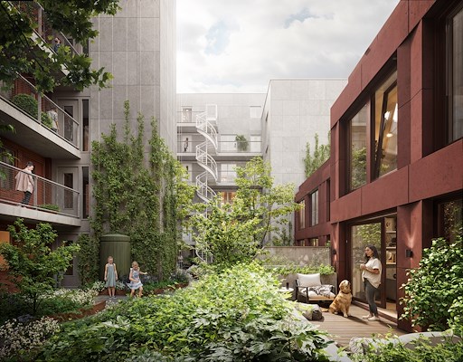 Het besloten binnengebied in het blok is opgevat als een doorlopende ruimte, die de gebouwen samenbindt. Deze verhoogde, van beplanting voorziene binnenplaats biedt de bewoners bovendien een tweede route naar hun appartement, naast de formele ingang aan de Oslofjordweg. De gemeenschappelijke binnenplaats is toegankelijk vanaf de Tarnweg.