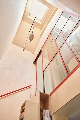 De smalle arbeiderswoning is compleet gerenoveerd, opnieuw ingedeeld en voorzien van een aanbouw. In het hart van de woning is een aantal functionele ruimten opgenomen in een groot blok van berken multiplex – het favoriete bouwmateriaal van de opdrachtgevers. Trap, toilet, berging en open kast vormen één één gestapeld gebaar in de ruimte.