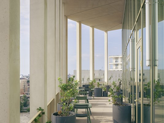 Het gebouw Facette staat op een prominente hoeklocatie aan de Boulevard Joliot-Curie, die een centrale as in de wijk vormt. Om die reden is ervoor gekozen om de begane grond transparant uit te voeren, zodat er een sterke visuele relatie tussen buiten en binnen ontstaat. Op de begane grond is een open omgeving met zowel werkplekken als publieke ruimte gecreëerd. De ruimte is geaccentueerd door en het oog springende betonnen bogen.
