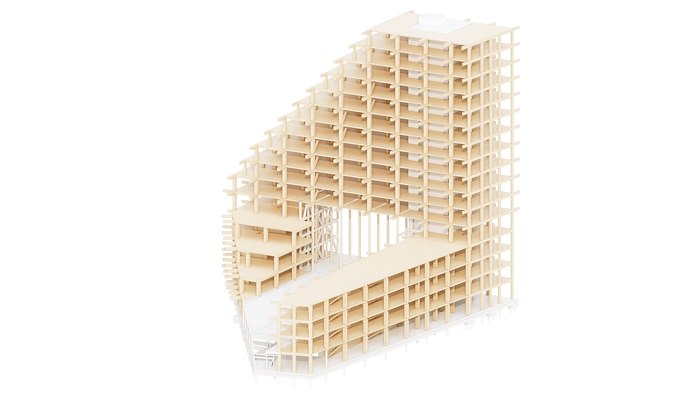 , is voor negentig procent gebouwd van hout (CLT). Het gebouw heeft wel een betonnen kern, maar het gebruik van dat materiaal is tot een minimum beperkt. Gewoonlijk worden vloeren uit CLT van een laag beton voorzien, maar in Sawa wordt droge ballast gebruikt.