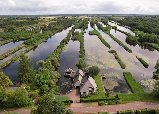 De villa staat in Tienhoven, een dorp in de Utrechtse Stichtse Vecht. De ruime tuin is aan drie zijden omgeven door water en vanaf het perceel kijken de bewoners ver de Molenpolder in. Net als de meeste huizen in de regio, zijn de gebouwen op het perceel voorzien van een rieten kap. Bij de verbouwing zijn de rieten daken vernieuwd, de gedateerde dakkapellen verwijderd en de gele bakstenen gevels gestuct met een warmgrijs kalkpleisterwerk.