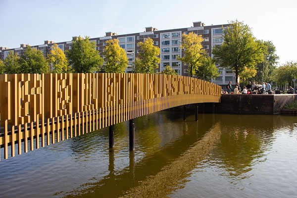 Woensdag is aan de Boelegracht in Amsterdam de zogeheten kunstbrug geopend. Het bouwwerk, dat het woongebied van de Zuidas verbindt met de tegenovergelegen De Boelelaan, is voorzien van een reling met belettering door kunstenaar Martijn Sandberg. In de spijlen is de zin ‘Opgelet! Kunstwerk! Opgelet!’ te lezen.