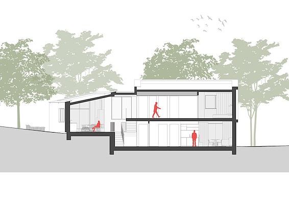 opgeleverd. Met een gelaagde splitlevel-opzet is het woonhuis ingebed in het landschap en de duinhellingen. Door veel uitzicht te creëren en een tuin met gevarieerde beplanting aan te leggen, kunnen de bewoners optimaal genieten van de groene omgeving.