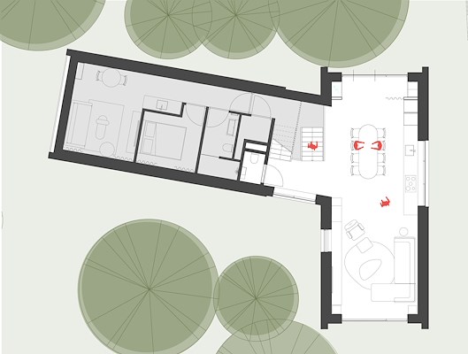 Hoewel de woning een compacte footprint heeft, kon dankzij de splitlevelopzet toch een ruimtelijk interieur worden gerealiseerd. De woning is ook nadrukkelijk bedoeld voor gasten. Op elke verdieping zijn plekken gecreëerd om samen te komen, met aangrenzende privé-woon- en gastenverblijven.