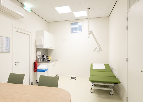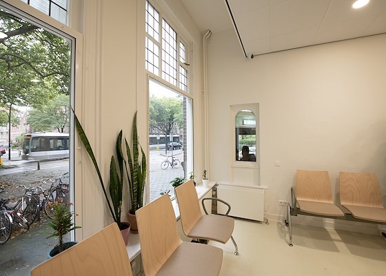 In het interieur zijn warme, lichte kleuren toegepast en is het historische karakter van het pand als inspiratie gebruikt. De strenge eisen op het gebied van verlichting, veiligheid, ventilatie en akoestiek streden om voorrang met de wens om een huiselijke, niet te klinische en prikkelarme omgeving te maken. De wachtruimte is voorzien van vast meubilair met oplaadpunten voor mobiele telefoons. Het onderscheid tussen eikenhouten en witte deuren en kozijnen bevordert de