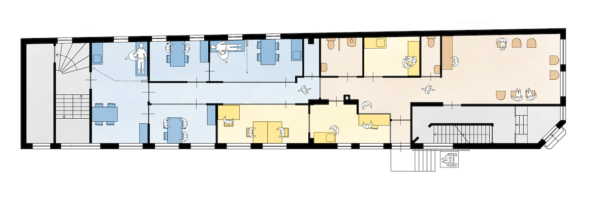 De Rotterdamse straatdokters gaan de zorg nu in een eigen huisartsenpraktijk verlenen. Patiënten kunnen zich inschrijven bij deze praktijk, die direct bij de verzekeraar kan declareren en nauw samenwerkt met het ziekenhuis. Omdat de praktijk nog niet bestaat is het ontwerpproces ingezet als middel om de verschillende eisen en wensen in beeld te krijgen. Open Kaart maakte in co-creatie met artsen en verpleegkundigen het ontwerp voor de herindeling van een bestaand pand, waar ook het Stedelijk Daklozenteam ruimte huurt en zich een aantal woonstudio’s voor de doelgroep bevindt.