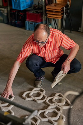 Biocirculaire materiaalontwerpstudio Omlab doet onderzoek naar biobased en circulaire materialen en ontwerpt productvoorbeelden om de bouwsector duurzamer te maken. Zo maakt de studio uit reststromen – bijvoorbeeld doorgespoeld toiletpapier of koeienmest – printbaar of extrudeerbaar materiaal, waarmee ze circulaire producten ontwikkelt, uiteenlopend van tegels en vogelhuisjes tot bouwmodules.