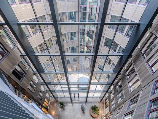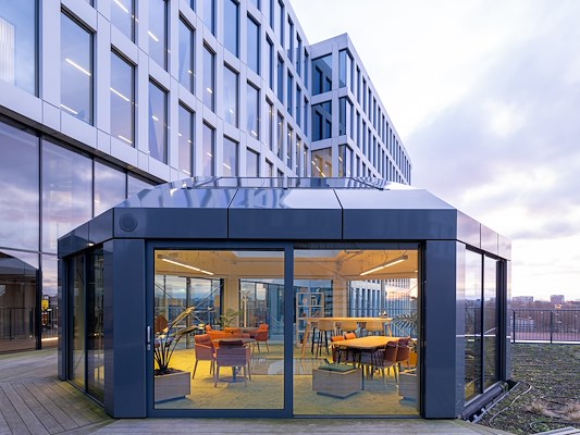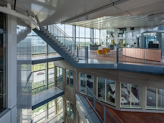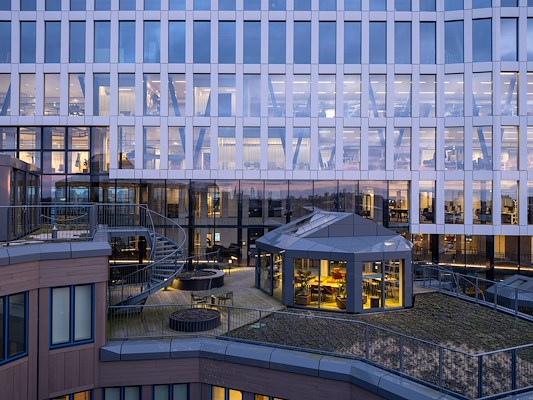 De kantoorruimtes zijn ontdaan van hun vele scheidingswanden, toiletblokken en liften, zodat het gebouw minder ‘verkamerd’ aanvoelt. Het complex is ook verduurzaamd, onder meer door de daken te vergroenen, zonnepanelen te plaatsen en de gevels te upgraden. Dit resulteerde in het certificaat BREEAM Outstanding, meldt MVRDV. De nieuwbouw voldoet eveneens aan hedendaagse eisen op het gebied van duurzaamheid.