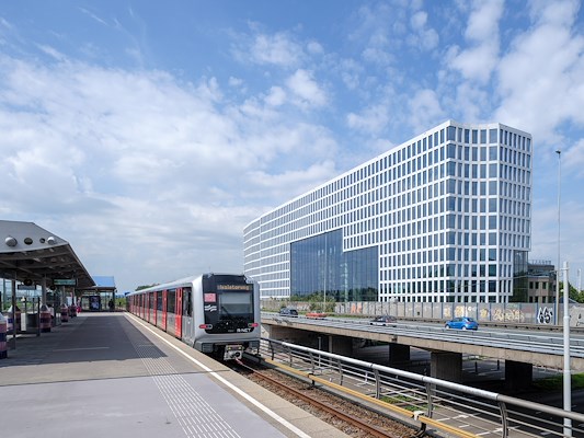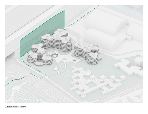 omvattende nieuwbouw langs de A10. Dit langgerekte en 45 meter hoge bouwwerk beschermt het achtergelegen park tegen geluid en fijnstof en laat dankzij een grote opening in gevel een deel van de bestaande gebouwen zichtbaar voor passerende automobilisten.