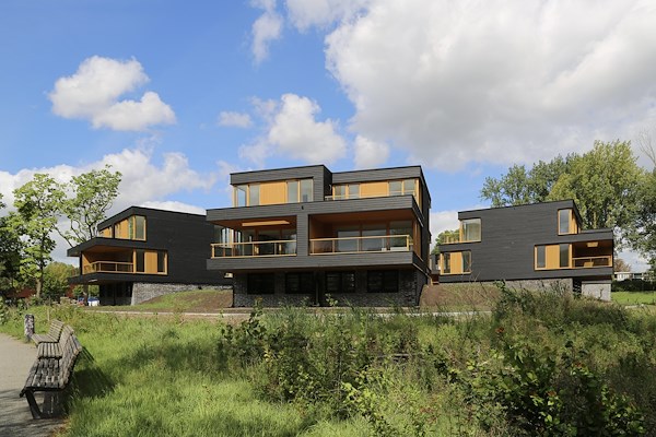 Permanente houten prefabwoningen in teruggebracht rivierduinlandschap