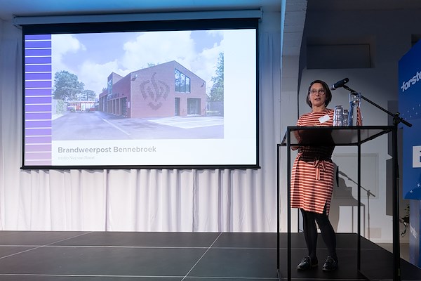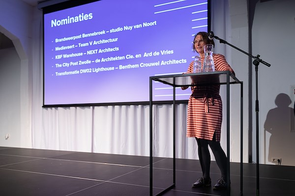 Jurylid Laura Favata presenteert de prijs voor Publiek gebouw van het Jaar 2024