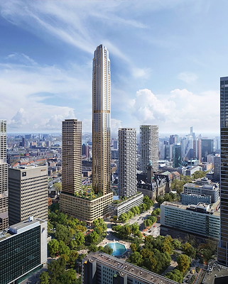 RISE wordt ontwikkeld door RED Company en is ontworpen door zusterbedrijf Powerhouse Company. Het project bestaat uit drie torens: de Coolsingeltoren (143 meter), de Weenatoren (158 meter) en de Hofpleintoren, die met 286 meter de hoogste wolkenkrabber van Nederland zal zijn. Lumière, ontwikkeld door Manhave en VORM en ontworpen door KAAN Architecten, wordt 155 meter hoog.
