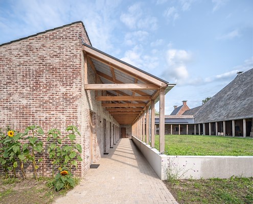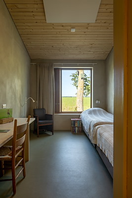 De karakteristieke ruimtes van de kop-hals-romp boerderij zijn zo goed mogelijk voorzien van een passende functie. De keuken is keuken gebleven, de opkamer is nu bibliotheek en de melkkelder is een zeer intieme kapel. Op zolder wordt gemediteerd. De grotere ruimtes voor ontvangst en maaltijden vonden als vanzelf een plek onder de grote kap van de schuur.