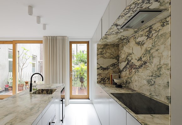 Het ontwerp is uitgevoerd met strakke, minimalistische details, naar voorkeur van de bewoners, die erg van Japans en Braziliaans design houden. Toppunt hiervan is wellicht de detaillering van het marmer in de keuken, vertelt Bas Vogelpoel Architecten. “Hiervoor zijn vrij exclusieve platen gebruikt, maar door ze in verstek te zagen zie je nergens de materiaaldikte en wordt het geheel
