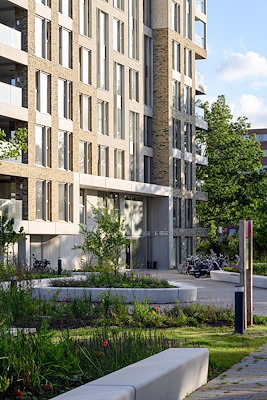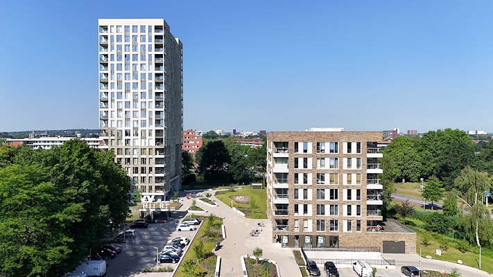 Verdeeld over beide gebouwen zijn 165 huurwoningen gerealiseerd in sociale en middensegment. In de verdiepte parkeergarage wordt zeventig procent van de benodigde parkeercapaciteit opgelost en op straatniveau zijn bezoekersparkeerplaatsen en plekken voor deelauto’s opgenomen. De ingang van de garage ligt prominent op het terrein tussen de twee gebouwen.