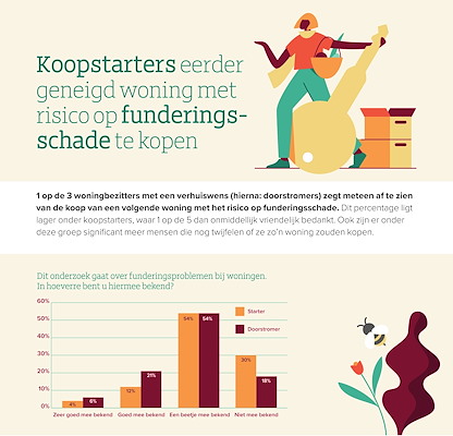 Uit het onderzoek blijkt dat 1 op de 3 doorstromers meteen afziet van de koop van een volgende woning, als daar risico op funderingsschade is. Onder koopstarters blijkt 1 op de 5 af te haken, al twijfelt onder deze groep significant meer mensen of ze zo’n woning zouden kopen. Een mogelijke verklaring voor het feit dat starters minder snel afzien van de koop geeft het onderzoek ook: deze groep is minder bekend met funderingsproblematiek dan doorstromers.