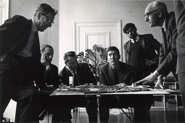 Willem van Tijen (rechts) in overleg met Sam van Embden, Jacques Choisy (links) en Leo Tummers (derde van rechts) over de maquette van de TH Twente, op 3 april 1962
