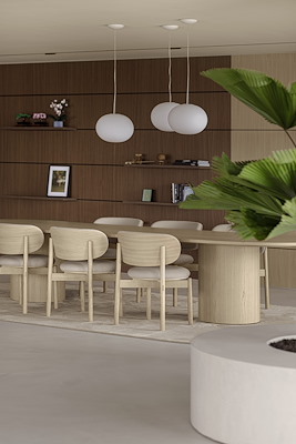 – heeft een open indeling, waarbij op maat ontworpen elementen de verschillende leefgebieden definiëren. Tegelijkertijd is daarbij de vloeiende beweging in de verbinding van de ruimten behouden. Grote houten oppervlakken en rijke texturen verlenen het interieur een luxe en eigentijdse uitstraling.