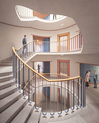 Om grotere ontmoetingsruimtes en plekken voor samenwerking te creëren, wordt het tussenstuk verder doorgetrokken richting het werkhuis, wat ten koste gaat van het door de Van Eycks ontworpen regenboogtrappenhuis daar. In het werkhuis komt een nieuw trappenhuis rond een vide, dat via een bestaand daklicht wordt voorzien van daglicht. Het trappenhuis wordt als een cilinder in het bestaande gebouw geschoven, de door de Van Eycks ontworpen gekleurde liftkaders worden door de cilinder heen ‘geponst’.