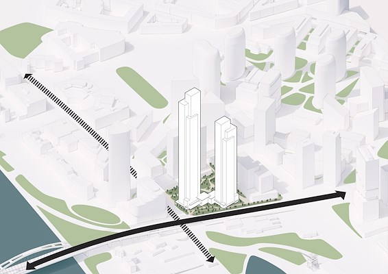 De torens zijn verbonden door een glazen paviljoen, waarin een binnentuin, cafés en andere typen ontmoetingsplaatsen zijn opgenomen. Ook biedt dit bouwdeel toegang tot een ondergrondse parkeergarage. De tweede verdiepingsvloer van het paviljoen is verlengd tot een luifel voor beide torens, waardoor het maaiveld wordt beschermd tegen valwinden van beide gebouwen. Het terrein voor de torens krijgt een groene inrichting met slingerende voet- en fietspaden.