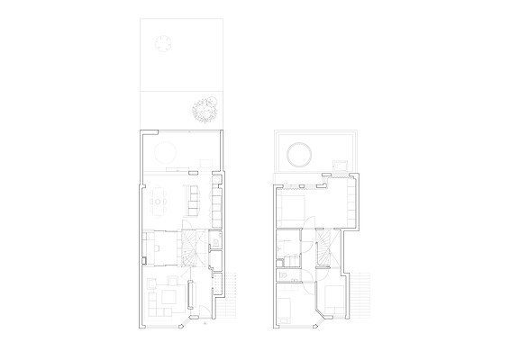 Het ontwerpconcept voor de samengestelde woning is: openheid en gelaagdheid. De leefgebieden op de begane grond – waaronder de entree, woonkamer, werkplek, keuken en eetkamer – vloeien soepel in elkaar over. Vanuit deze leefruimten leidt een tuinkamer naar de buitenruimte achter de woning.