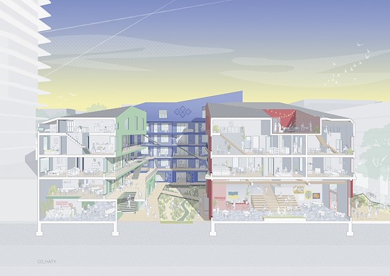 Het project bevordert de integratie tussen nieuwkomers en Rotterdammers en versterkt de diversiteit van de stad, meldt de RAVB. Collectiviteit staat centraal in het ontwerp: drie woonblokken rond een zonnige, groene buitenruimte zijn verbonden door houten galerijen die ontmoetingen faciliteren. Naast woningen omvat het ontwerp gemeenschappelijke voorzieningen zoals keukens, een wasserette en ontspanningsruimtes.