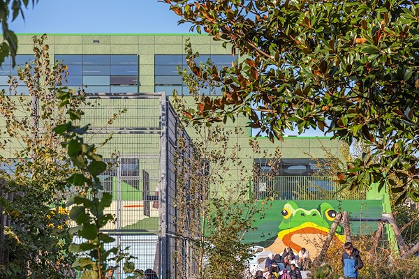 De gevel van onderwijscomplex De Kikker in Amsterdam is grondig vernieuwd. De oude gifgroene beplating heeft plaatsgemaakt voor een kleurrijke gevel van zonnepanelen. Met de zonnepanelen werkt het gebouw ongeveer dertien procent van zijn jaarlijks elektriciteitsverbruik op.