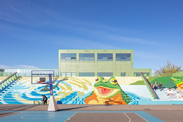samen met leerlingen van De Kikker een bijpassende schildering aangebracht op de publieke buitentribune.