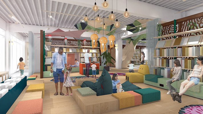 , verdeeld over twee verdiepingen. Het ontwerp is doordrenkt van lokale inspiratie en kleur, meldt het ontwerpbureau. Het plan omvat onder andere een multifunctionele ruimte met keuken en infobalie, een ‘kidsplace’, een jongerenruimte met ‘chill cave’ en een ‘MakerSpace’. Ook voorziet het ontwerp in vergaderruimten en kantoren.