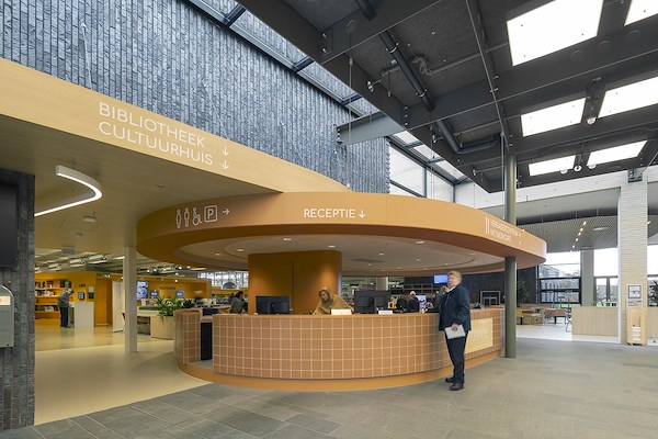 Er is één centrale balie gerealiseerd, die samen met het naastgelegen netwerkcafé het nieuwe hart van het gebouw vormt. Vanaf de balie kunnen bezoekers navigeren naar hun plek van bestemming. De historische typografie waarin het woord ‘receptie’ is geschreven, is afkomstig van de gevelnaam van de vroegere jongens- en meisjesschool in Heemskerk.