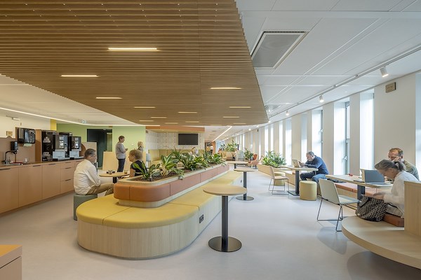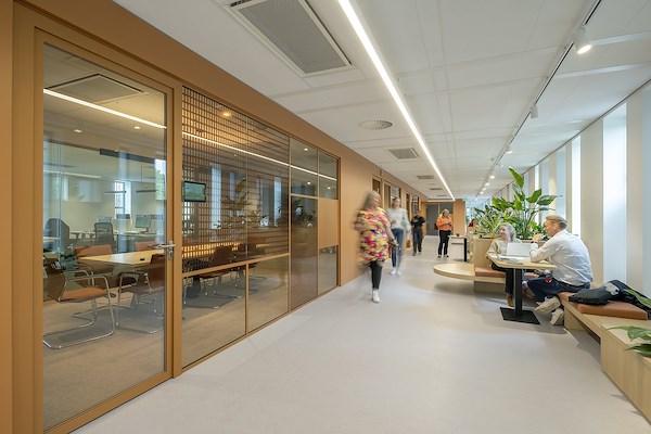De gemeente heeft het aantal werkverdiepingen teruggebracht van twee naar één. De vrijgekomen verdieping wordt nu verhuurd aan maatschappelijke organisaties. De verdieping waar ambtenaren van de gemeente nu werken, bestaat uit twee vleugels met daartussen de centrale ‘huiskamer’. Er zijn verschillende soorten werk- en vergaderplekken gerealiseerd, van teamruimtes tot bel- en concentratieplekken.
