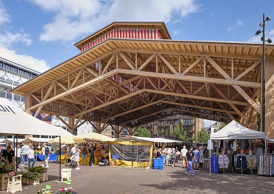 , is vrijwel geheel van hout gerealiseerd. Het uitstekende deel van het dak heeft een gevel van gekleurde glaspanelen die overdag kleurig licht in de markthal laten binnenkomen en in de avonduren subtiel oplichten onder invloed van kunstlicht.