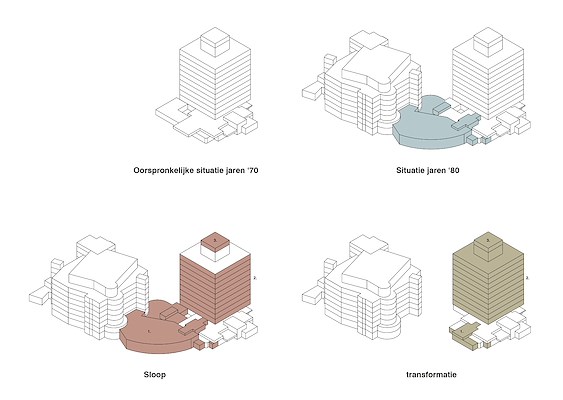 Ook het hogere deel van het gebouw behoudt zijn karakter. De karakteristieke dragende betonnen verticale delen blijven behouden. De horizontale gevel daarachter wordt vervangen door een gevel die in uitstraling de oude zoveel mogelijk benadert, maar wel voldoet aan de daglicht- en isolatie eisen van nu.