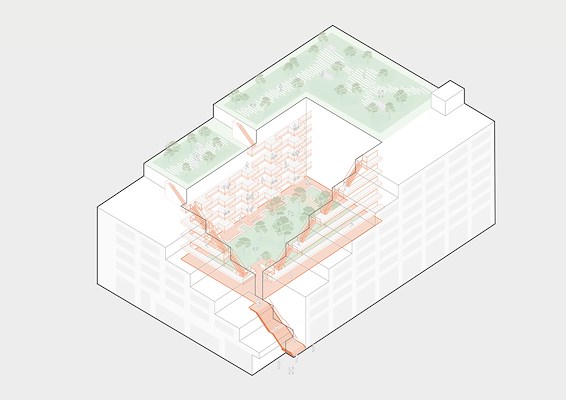 De verplichte vluchttrappen zijn ingezet als de meest voor de hand liggende route voor de bewoners naar hun huis. Samen met de zogeheten leefgalerijen vormen ze vanaf het plein en de binnentuin de snelste toegang tot de woningen. Op die manier worden traplopen en ontmoeting gestimuleerd, menen de architecten.