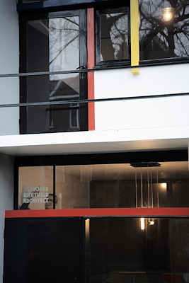 De bedrijfsnaam ‘Schröder & Rietveld Architect’ staat opnieuw op het raam