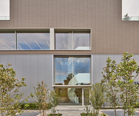 ontwierp voor het ontwikkel- en bouwbedrijf een abstract volume als werkplaats, waarop het kantoor met royale buitenruimten is geplaatst.