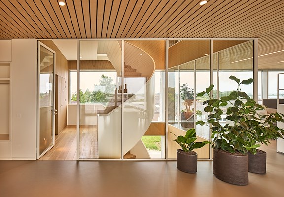 Grote raampartijen bieden vanuit het kantoorvolume panoramisch zicht in verschillende richtingen, zoals op het landschap van het Zwarte Water en het historische centrum van Genemuiden.
