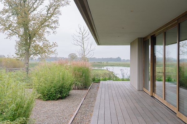 Het woonhuis door Loer Architecten is dus ontworpen volgens een schuurtypologie, maar met een voor een woning herkenbare materialisatie en kenmerken als een opvallende schoorsteen die door het dakoverstek steekt. Aan de tuinzijde en de kant van het water zijn royale ramen en puien gerealiseerd die de bewoners voorzien van uitzicht op de omgeving.