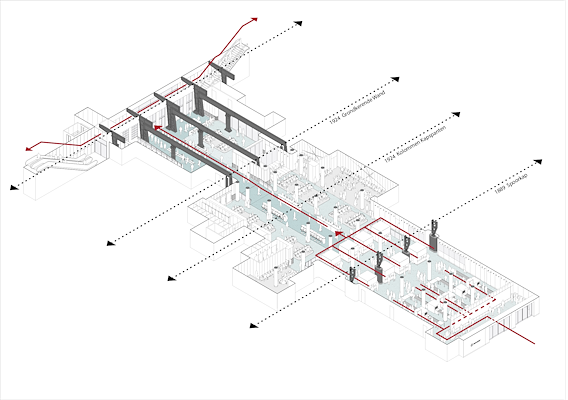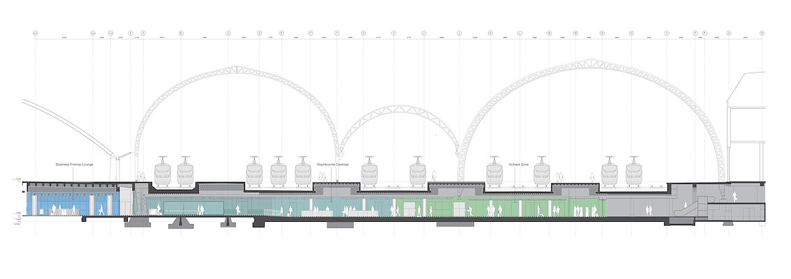 De terminal is ontworpen als een heldere en symmetrische ruimte, waarbij de centraal gelegen opgang naar de treinen tussen de bestaande kolommen doorloopt. Andere kolommen van het stationsgebouw zijn zo subtiel mogelijk geïntegreerd in de ruimte. Op enkele plekken zijn de kolommen opgenomen in de wanden, waarachter functies als toiletten zijn gerealiseerd.