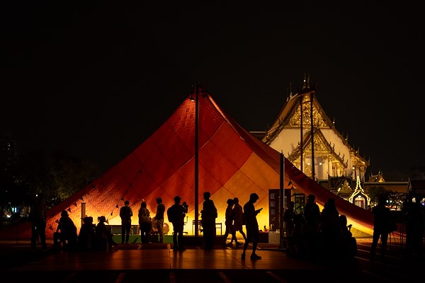 Met zijn felle kleuren brengt de mat levendigheid op het stadhuisplein. Deze gebruikte kleuren zijn ook een verwijzing naar de felgekleurde daken van de nabijgelegen Wat Suthat Thepphawararam-tempel.