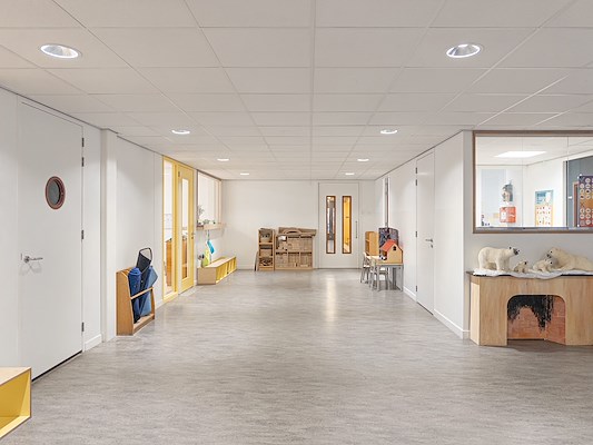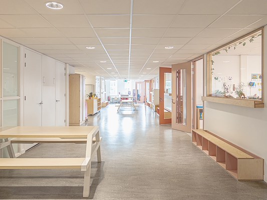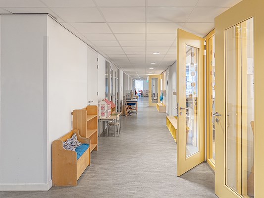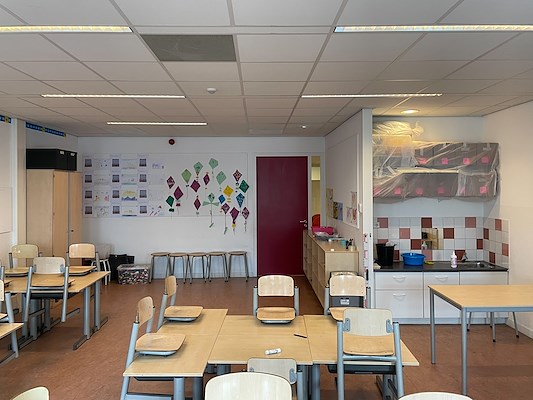 Het architectenbureau heeft met kleine ingrepen zoveel mogelijk effect proberen te bereiken. De lokaalwanden zijn voorzien van transparante entrees en een groot venster, zodat er nu een fysieke en visuele verbinding is met de leerpleinen buiten het klaslokaal.