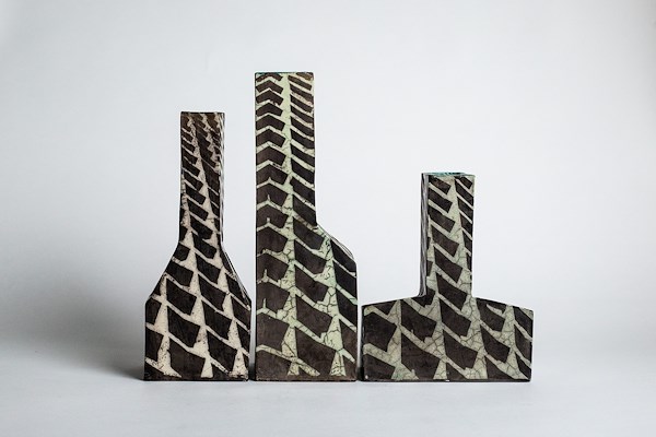 Barnett werkt ook met het selectief glazuren, in wit of celadon-tint, voor het patroon aan de buitenzijde van de vaas. In het vuur worden de ongeglazuurde delen zwart. Tekeningen of foto’s van bestaande gebouwen of landschapsontwerpen dienen als inspiratiebron voor de patronen. Ze vervormen en verzachten de lijnen van de sculptuur, wat resulteert in een gelaagd karakter.