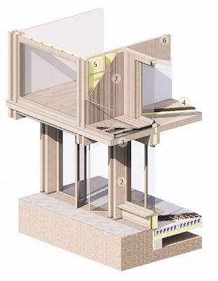 Voor De Boomhof gebruikt het ontwerpteam veelal biobased materialen in een demontabel bouwsysteem van prefabelementen. Zo wordt, naast de genoemde constructie uit wand- en vloerelementen van CLT, gebruik gemaakt van HSB-gevelelementen en in Nederland geteeld vlas als isolatie.