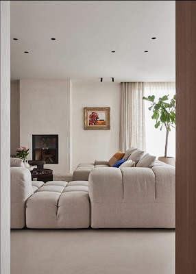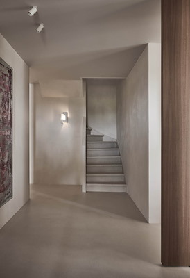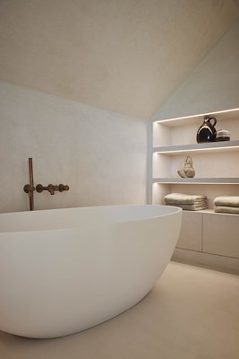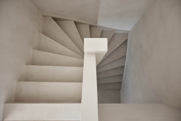 In de basis is microcement gebruikt in een lichte zandkleur. In het hele huis zijn vloeren, wanden en plafonds afgewerkt met dit cementgebonden materiaal met minerale pigmenten. Ook de badkamers en de trap zijn voorzien van deze afwerking. “Dit materiaal wil je aanraken, omdat het voelt als een zachte huid. Doordat het zo consequent is doorgevoerd, ervaar je in het gehele huis eenzelfde sfeer.”
