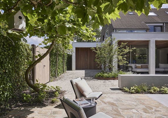 Om een ervaring van openheid en ruimtelijkheid in de woning te creëren, heeft Ex Interiors bestaande openingen in de gevels groter gemaakt. Aan de achterzijde, gelegen op het zuiden, is een grote pui gerealiseerd met een daaraan gekoppelde patio. Binnen en buiten vloeien hierdoor in elkaar over en daglicht komt dieper het huis in, legt het architectenbureau uit.