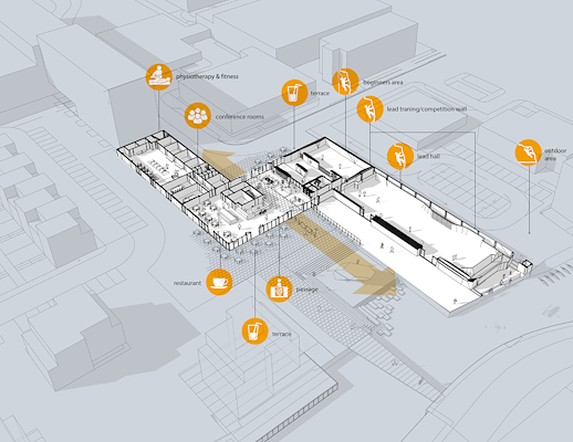 als een sterk transparant gebouw, met een publieke voetgangersroute dwars door klimcentrum.