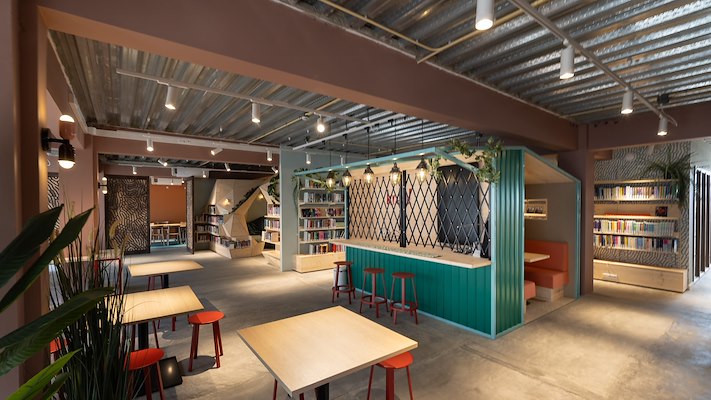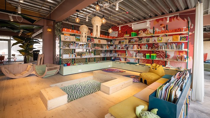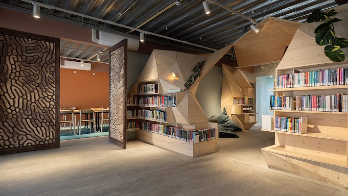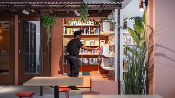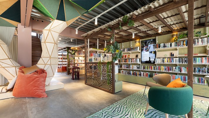 Sfeervolle stadsdeelbibliotheek in oude supermarkt